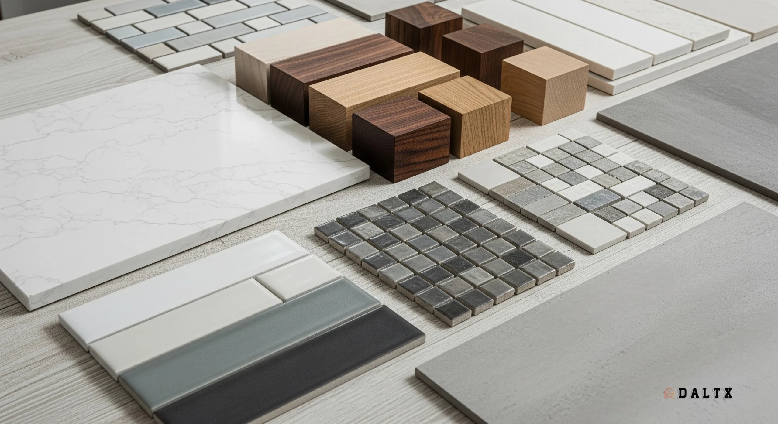 - Counters: Quartz for low maintenance and a clean look in kitchens and baths.