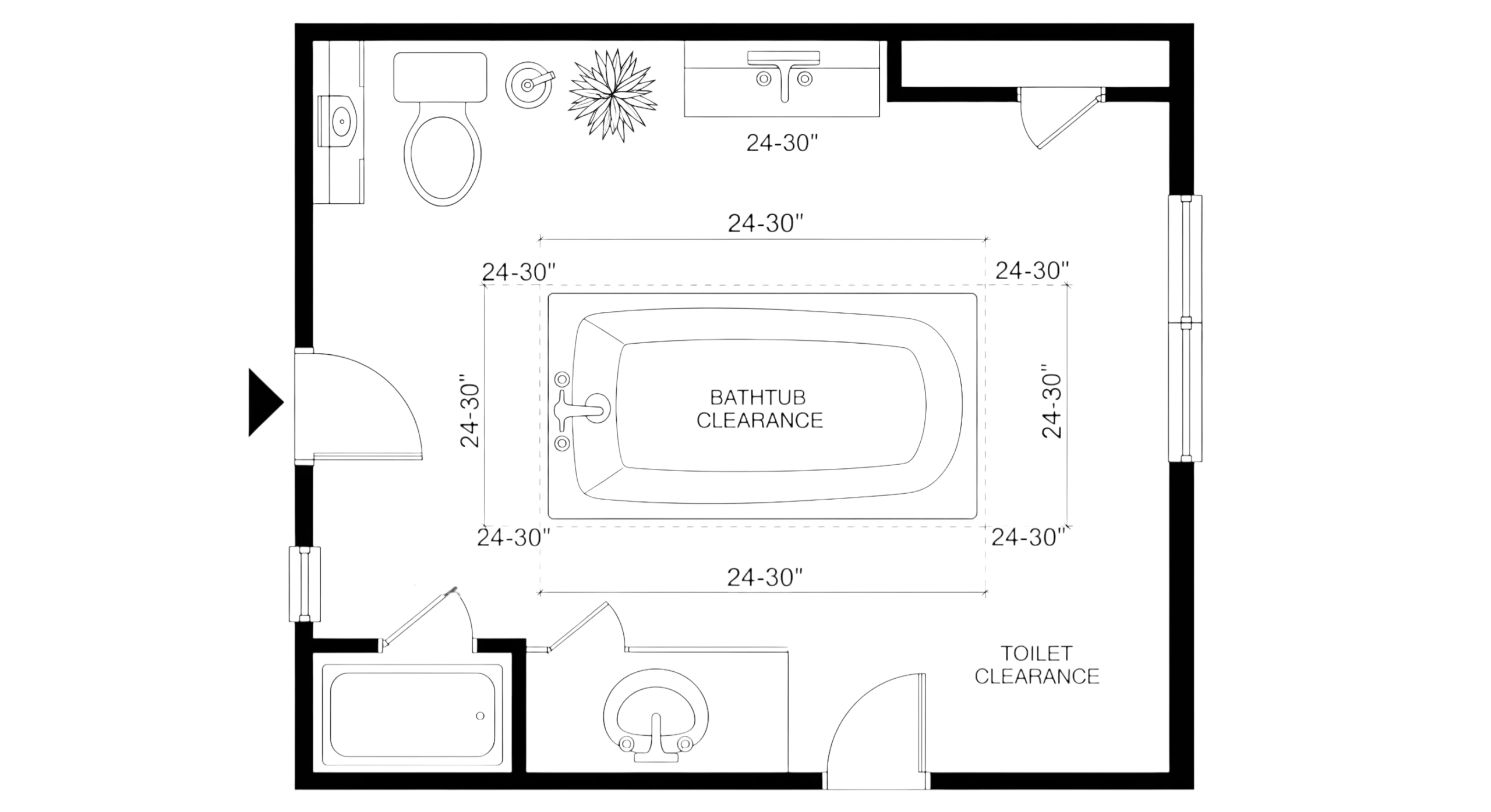 The gentle curves of an oval tub soften the hard lines of walls and vanities, bringing balance to tight spaces. A standard 55″ × 28″ oval tub can comfortably fit in a 54 sq. ft. bathroom while still leaving around two feet of walking clearance.