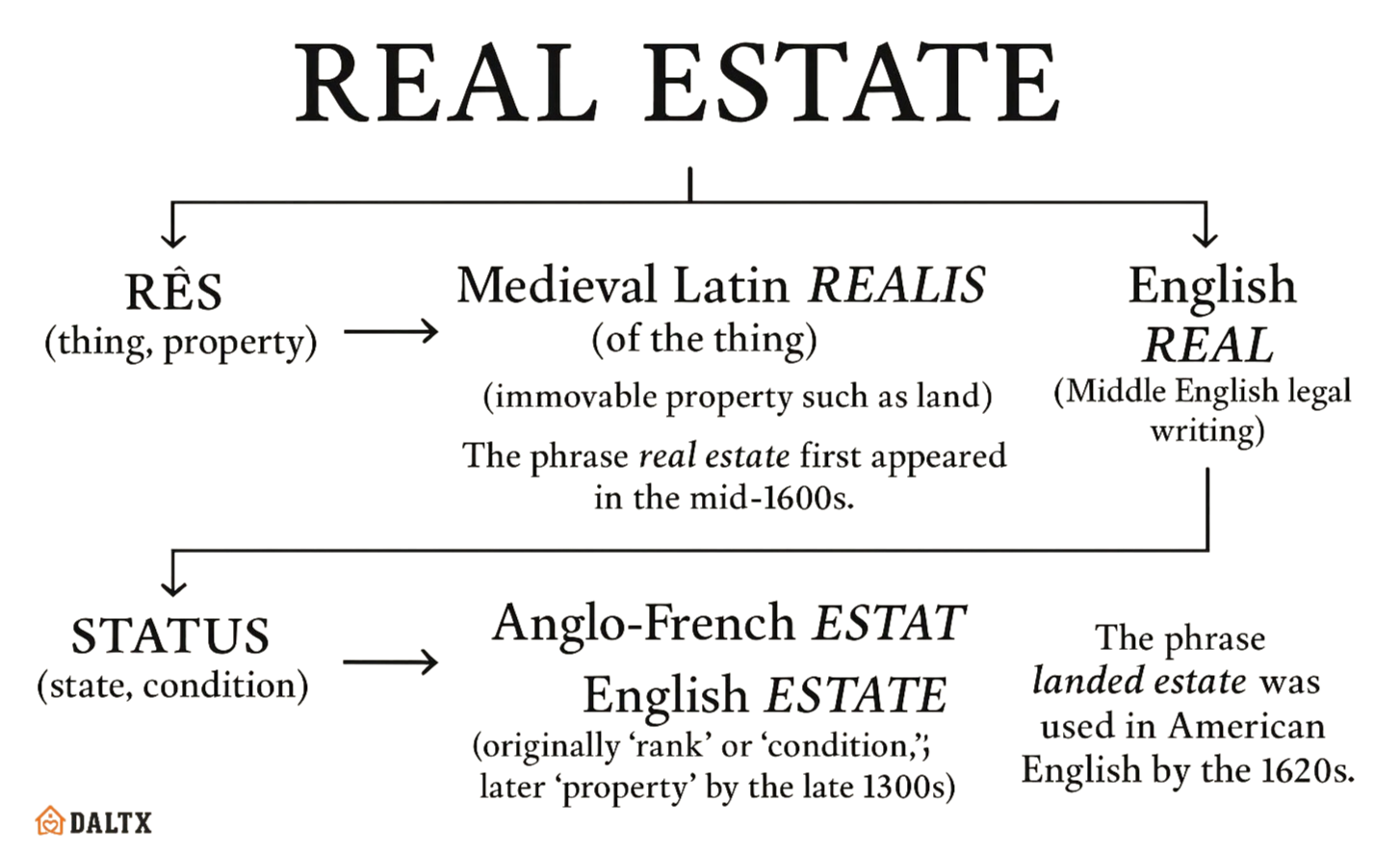 • Real” comes from the Medieval Latin realis (“of the thing”), which itself comes from the Latin rēs (“thing” or “property”). In English legal writing dating back to Middle English, real referred to “things” in the legal sense, especially immovable property like land, as opposed to personal (movable) goods. The exact phrase real estate first appeared around the mid-1600s.1